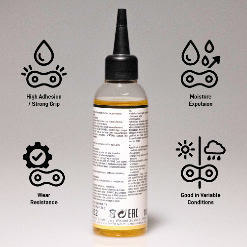 Especially for lubrication and care of bike chains under wet or moist conditions. Also suitable for e-bikes.