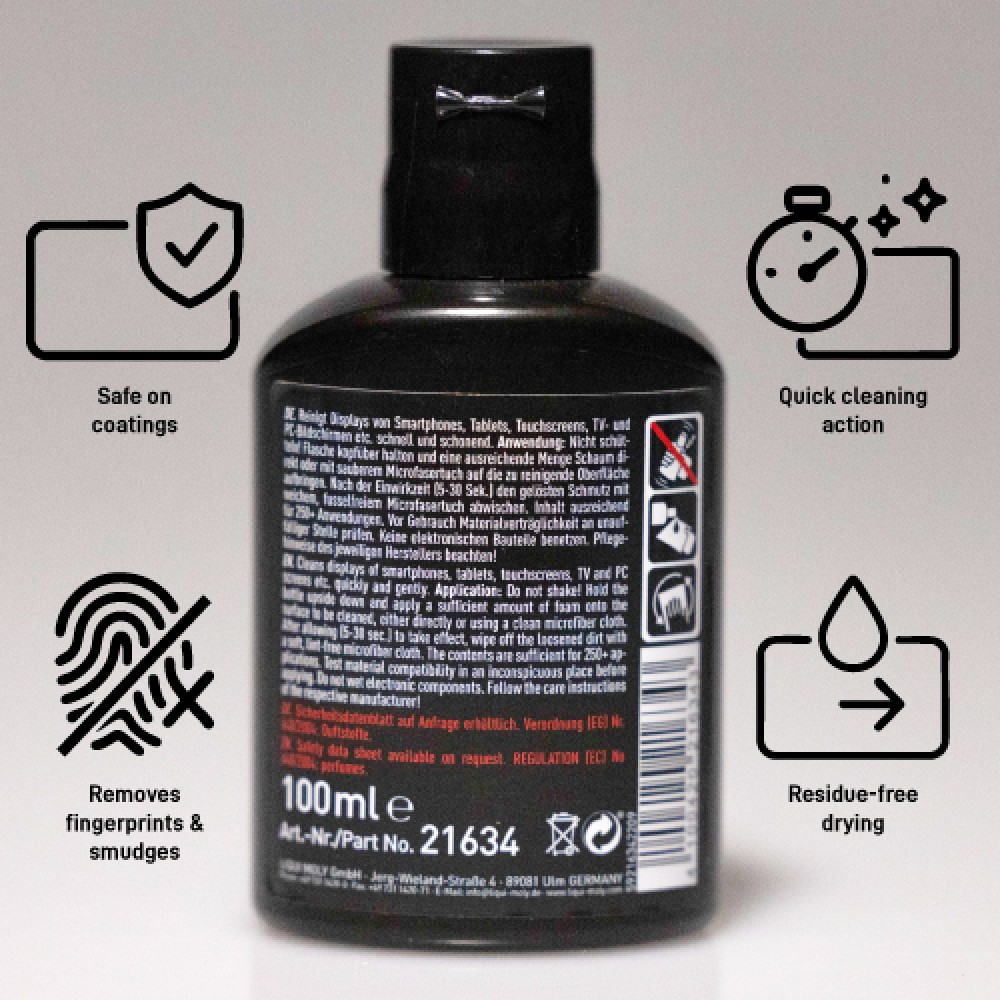 Powerful foam cleaner with innovative microfluid technology for fast, gentle display cleaning. Removes light soiling typical for the application, ensures streak free cleaning and is uncompromising toward dirt and fingerprints while remaining gentle toward the surface. Thanks to the convenient little bottle, is also practical when on the go or in the car. Leakproof thanks to the lack of propellants.