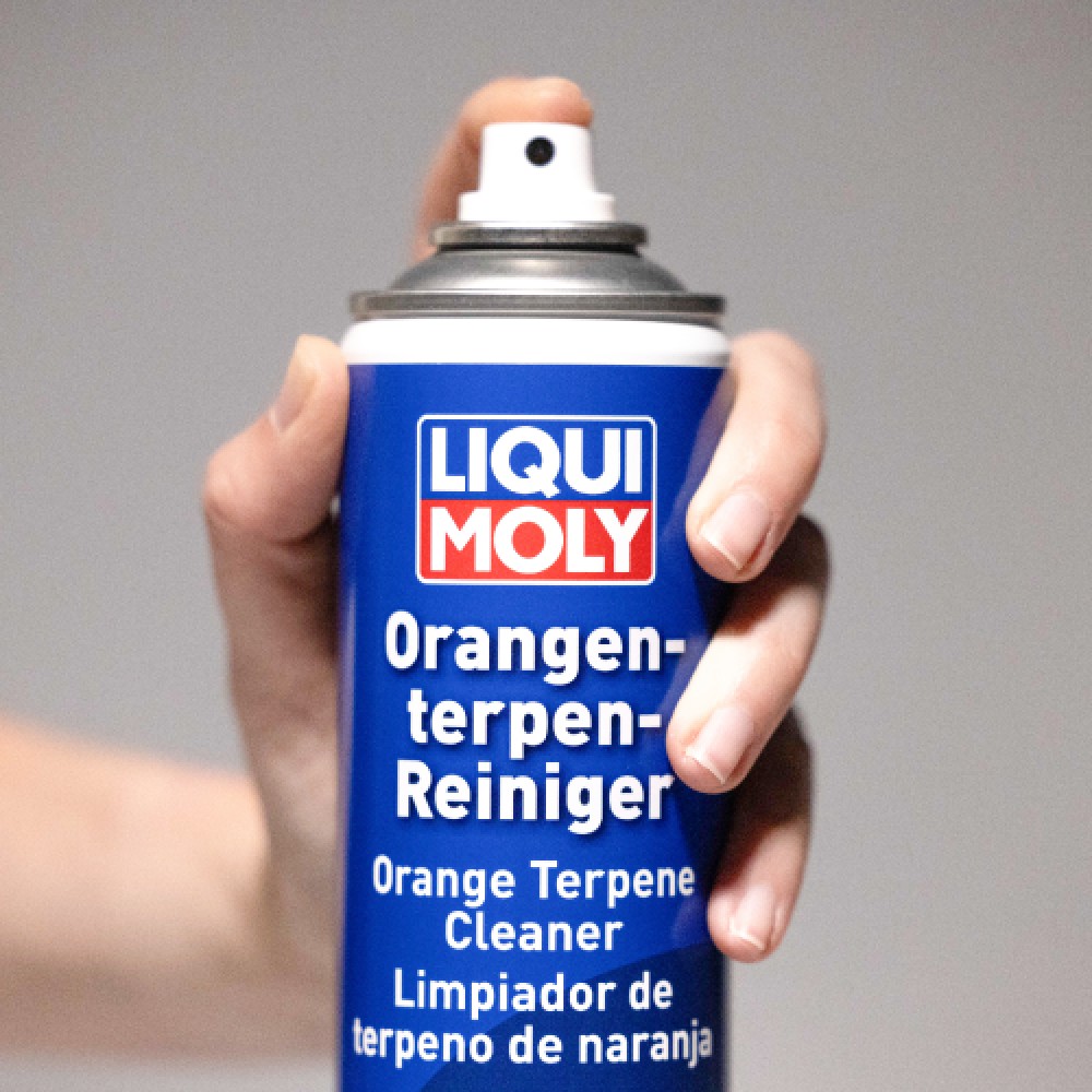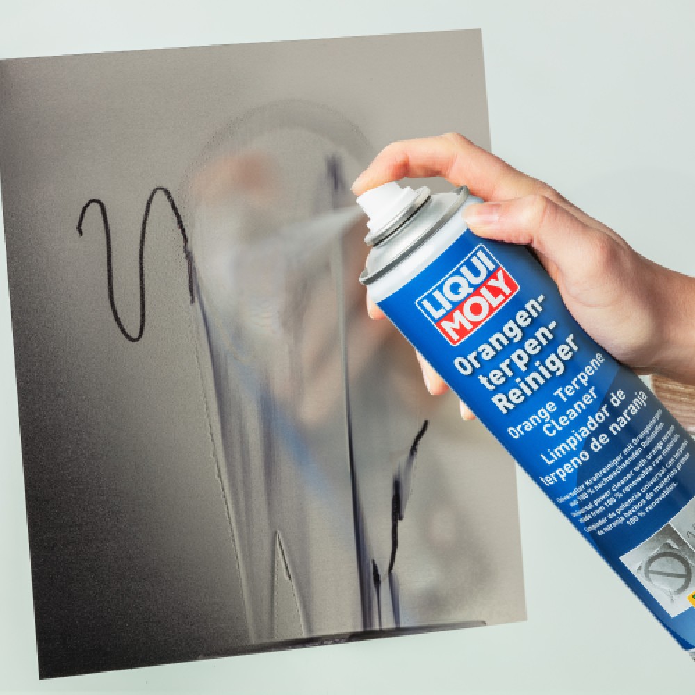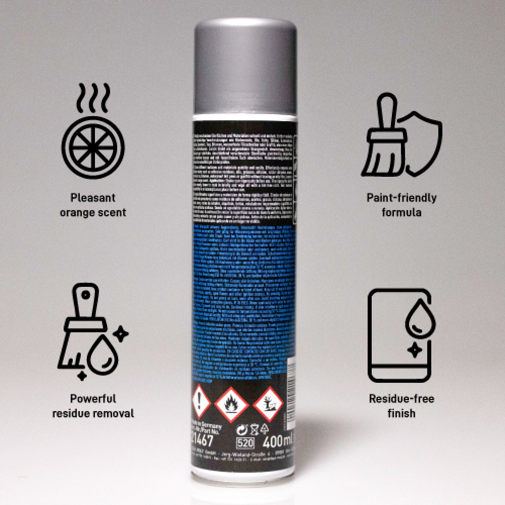 Universally applicable power cleaner that contains, among other things, orange terpenes made from 100 % renewable raw materials. With its biodegradable solvents made from orange oil, quickly and easily removes even stubborn dirt such as adhesive residues, oils, greases, silicone, rubber abrasion, waxes, tree resin, tar, bitumen, waterproof felt-tip pens or graffiti without leaving an oily film. Leaves a pleasant orange scent.