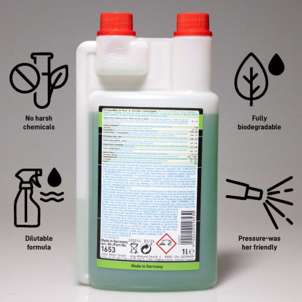 Concentrated universal cleaner that can be diluted with water for cleaning walls and floors as well as for use in high-pressure and spray appliances. Phosphate-free, silicate-free and solvent-free and biodegradable. Depending on the use mixing ratios up to 1:2,000.
