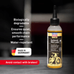 Excellent long term lubricant with nano-technology for bike chains, especially developed for moist and dirty conditions. Ensures particularly smooth operation. Protects all metal parts against corrosion. Neutral in contact with plastics, paint and metals. Vegetable base to prevent environmental pollution.